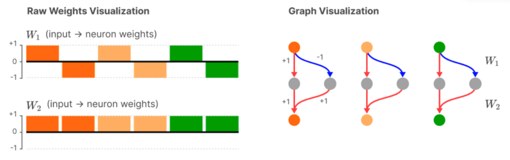 Some of the computation is as before (middle panel). For example, consider the dark blue feature. It has two hidden layer neurons encoding it, one with positive weight and one with negative weight. These combine with equal positive weight to the darkblue output features, giving us the natural solution for that input feature. A similar thing is done for the light blue and dark orange feature.