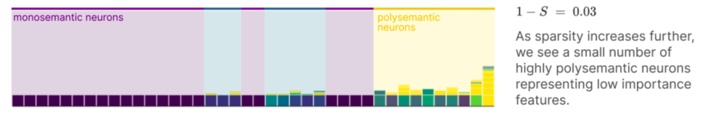 In the setting above there were two hidden units per input feature, so no superposition was required. To observe the effects of superposition, they next tried a setting with less than half as many hidden units as input features. They additionally weighted the earlier features to be more important than later ones. They found, as before, that when inputs are dense, all hidden layer neurons are monosemantic (represent one feature). When inputs are very sparse, all hidden layer neurons are polysemantic, representing multiple features. For intermediate sparsity levels, they found a mixture, with the most important features tending to be represented monosemantically: