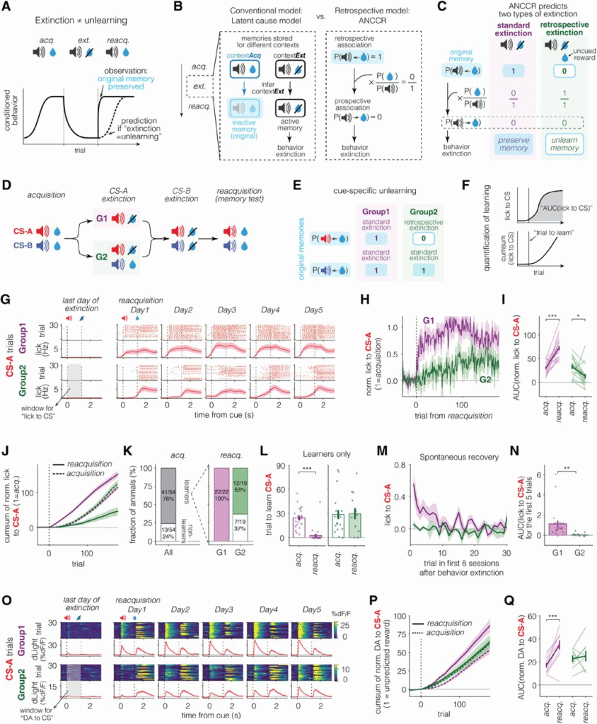 The authors’ explanation for this pseudo-forgetting is that classical extinction destroys the prospective association (cue to reward), but not the retrospective one (reward to cue). They predict that they can induce true forgetting in a different kind of extinction trial, where the reward is presented repeatedly without the cue. This should break the retrospective association of the cue with the reward, and animals should revert to their, slower, pre-training rates of acquistion when the reward is presented again. This is indeed what they observe: