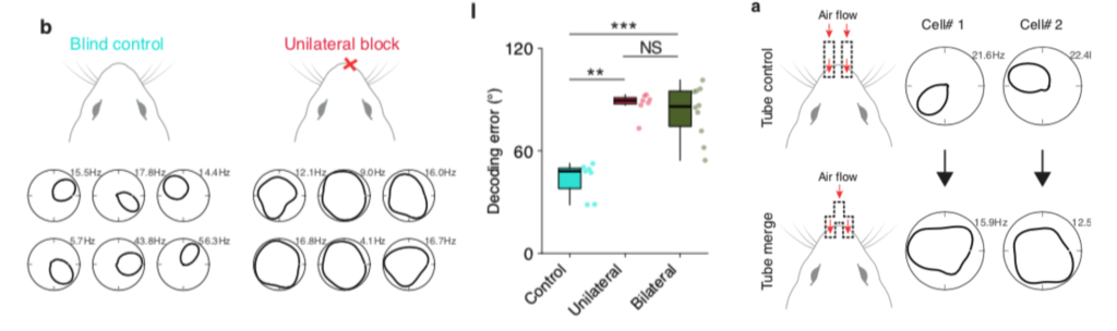 The first one shows the tuning of some head-direction cells in control mice. These mice were blind so had to use other modalities, to compute head direction. Indeed, when one of the nostrils was blocked, the head-direction tuning mostly disappeared. Decoding of head-direction was correspondingly perturbed, as shown in the middle panel. If the mice weren’t using olfactory cues, then blocking the nostril shouldn’t have made a difference. If they were using mono-olfaction, then blocking a single nostril also shouldn’t have made a difference. Further, they found that if they presented the same odour stream to both nostrils, head-direction was similarly perturbed.