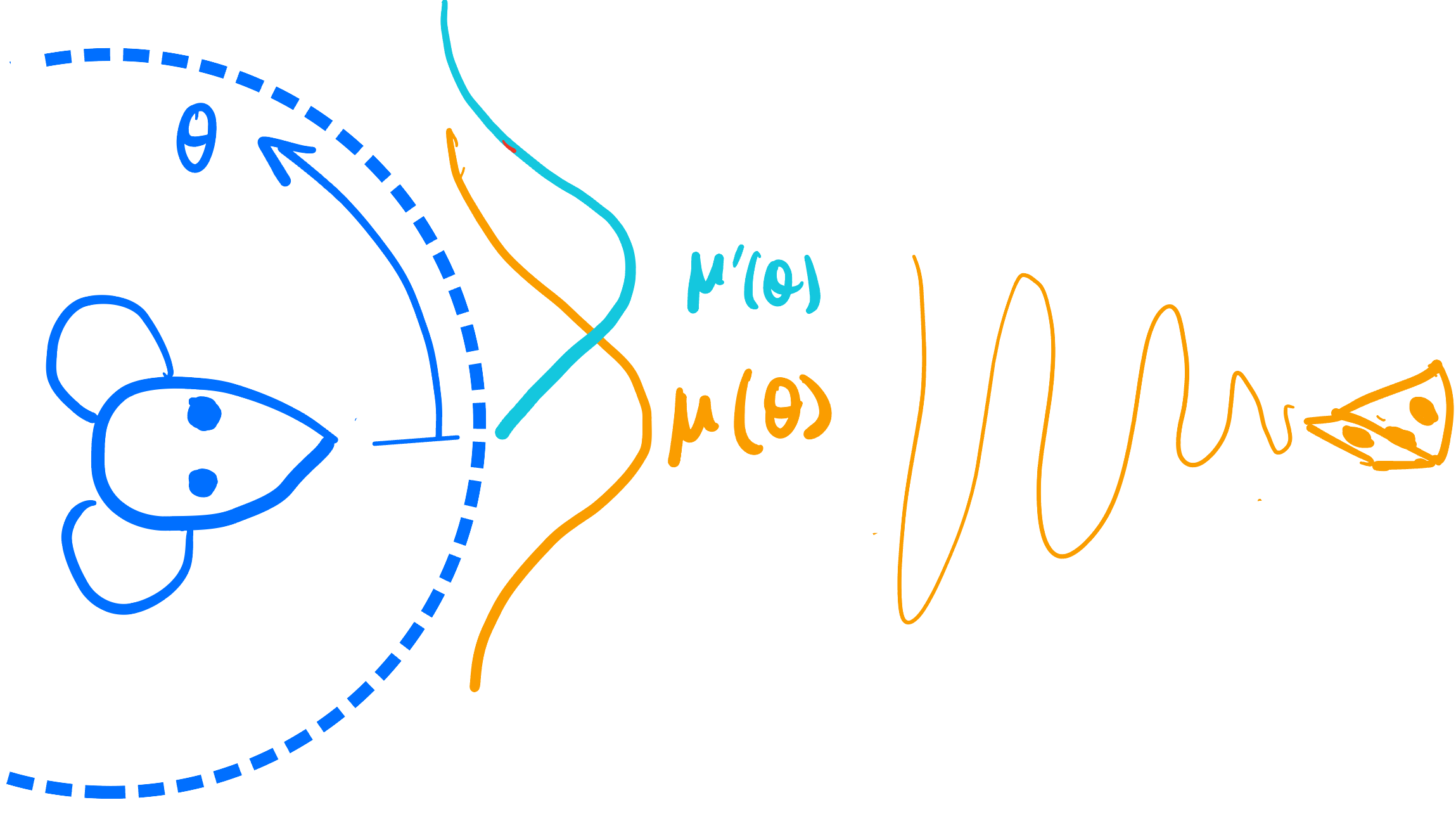 We’ll need a model of how this mean concentration determines the flucutating signal at a nostril. Perhaps the simplest model is to imagine the mean concentration as the average rate of arrival of odour packets from the source. If we assume these odour packet arrivals are memoryless, then the corresponding model is a Poisson process with rate determined by the concentration. We’ll assume that the odour packets are arriving fast enough that we can approximate the Poisson process with a Gaussian with the same mean and variance. So our mono-olfaction signal would be $$ m(\theta) \sim \text{Poisson}(\mu(\theta)) \approx \mathcal{N}(\mu(\theta), \mu(\theta)).$$