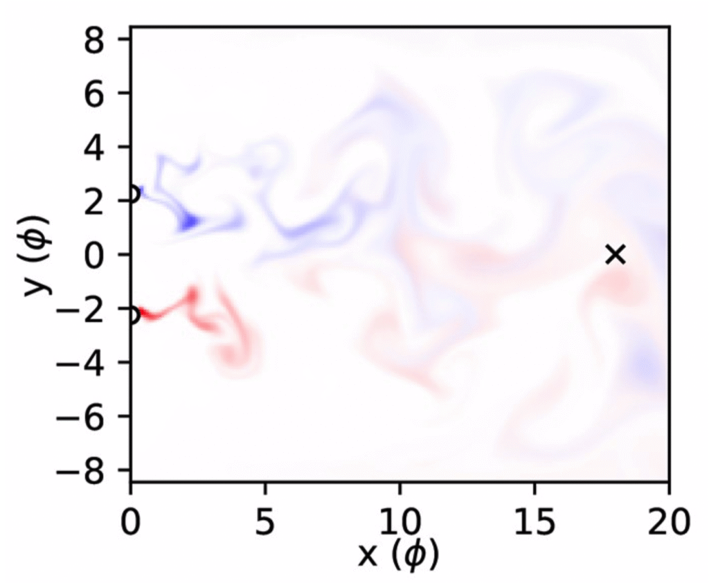 The plumes generated by two odour sources become less correlated as sources get farther apart, indicating that correlations contain spatial information. In this study from 2025 we showed how to quantify this spatial information, and found that high frequency components are more informative than low frequency components when sources are close together. This suggests that the high frequency odour acuity observed in mice could be useful for odour source localization.