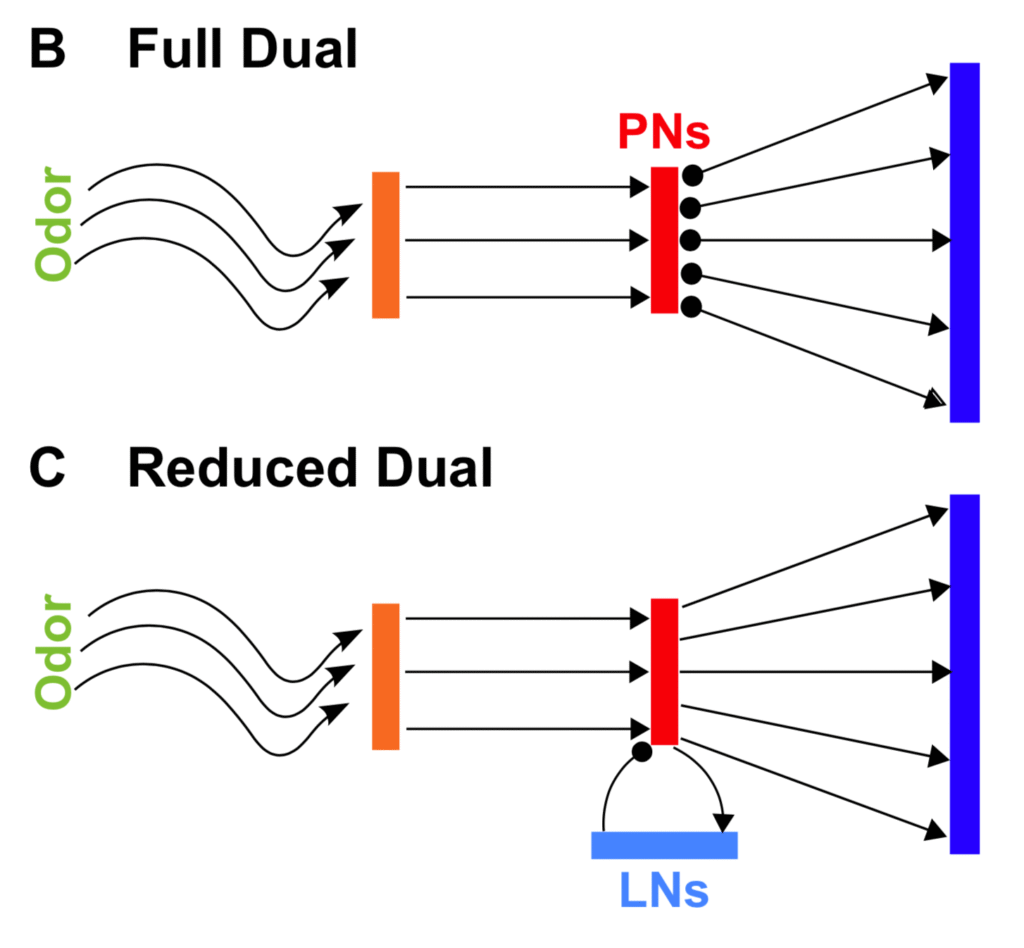 In this work from 2014 we formulated olfaction as in inference computation and showed how solving the dual optimization problem yields an architecture and dynamics qualitatively similar to many olfactory systems. The locust olfactory system that we were interested in understanding wasn’t large enough to accommodate the resulting algorithm in full, so we showed how it could approximate the full solution by continuously learning the statistics of the environment using a biological plausible implementation of expectation maximization.