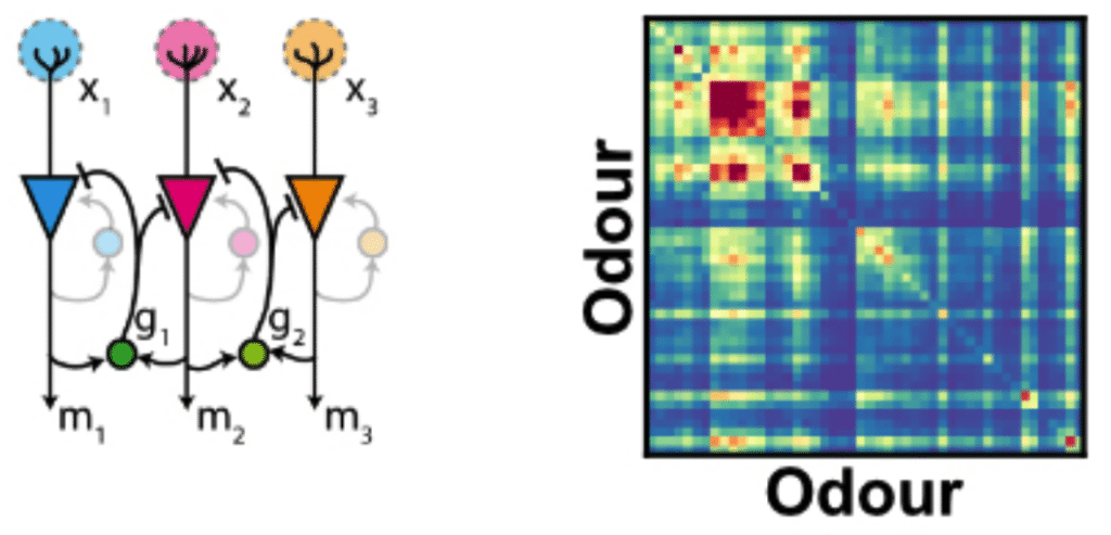 Neural recordings can often be biased towards responsive neurons. Prior experimental work had shown that when recordings are performed in an unbiased way, odour responses are dominated by cells which are silent during the baseline period, and vise versa. In work presented at COSYNE 2022 (abstract, poster), I provided a normative explanation for these findings as implementing “common feature subtraction“, wherein the olfactory system distinguishes odours from background air and gradually subtracts the odour components common to recent sniffs to emphasize the unique olfactory features present in each sniff.