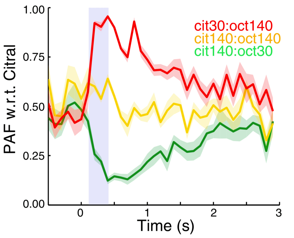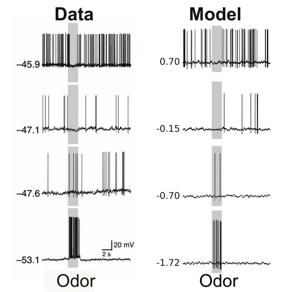 Our intuition tells us that olfaction is a slow sense, operating on the order of seconds. In this 2021 study, my colleagues showed that mice could be trained to distinguish odour concentration fluctuations at up to 40 Hz. Reviewers were initially skeptical that this could be done, since signalling by individual olfactory sensory neurons happens more slowly. My contribution was to show in simulation that such discriminations could be performed even with slow sensory neurons, as long as there were enough available to signal a given fluctuation.