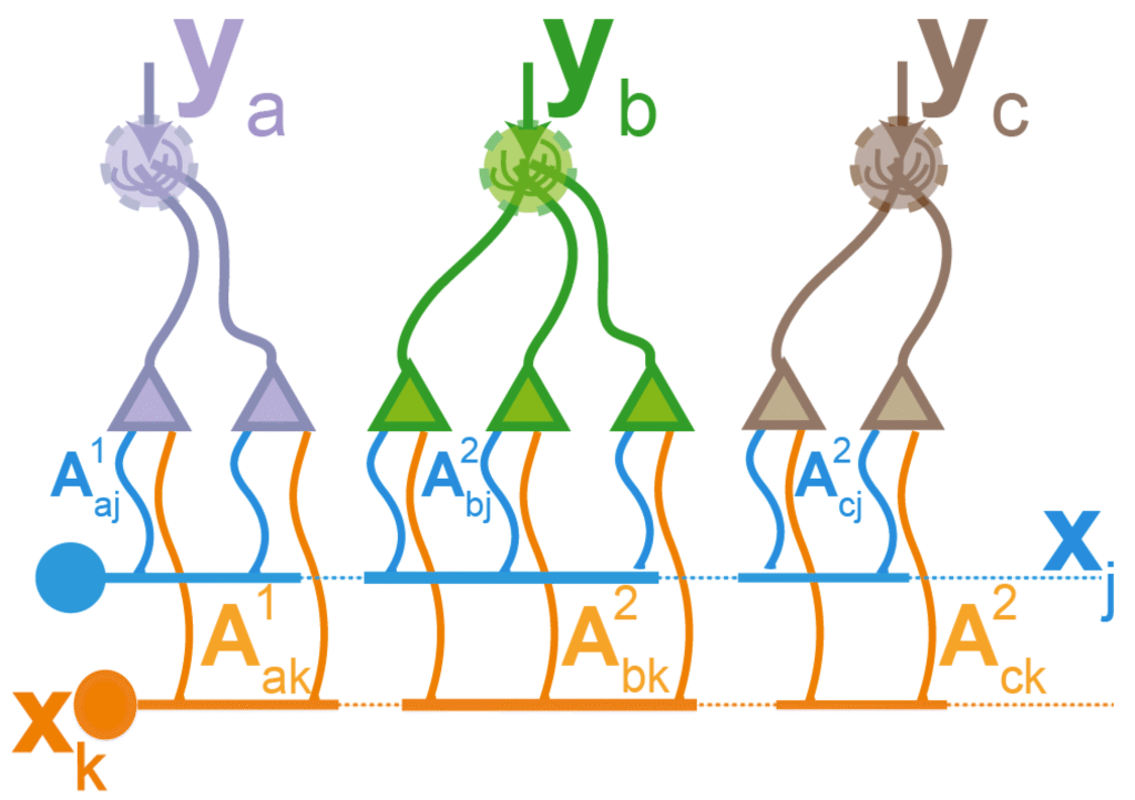 In the olfactory bulb, sensory signals converge by receptor type onto dozens of “sister cells” which thus receive the same input, but connect differently to local interneurons. In this study from 2022 we suggested that this architecture could allow the bulb to sparsify the dense connectivity required for inference by distributing it among the sister cells, with a population of glomerular interneurons ensuring sisters converge to the same inferred odour.